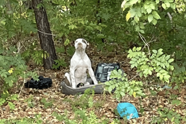 Hank was just an 8-month-old puppy when a compassionate passerby came across him abandoned in the woods. Unlike most puppies his age, he wasn’t running around or exploring with boundless energy. Instead, Hank sat quietly on a discarded dog bed, surrounded by a few of his toys and a bag of dog food he couldn’t reach, as if waiting for someone to notice him. His eyes told the story of his struggle, filled with desperation and longing for help.